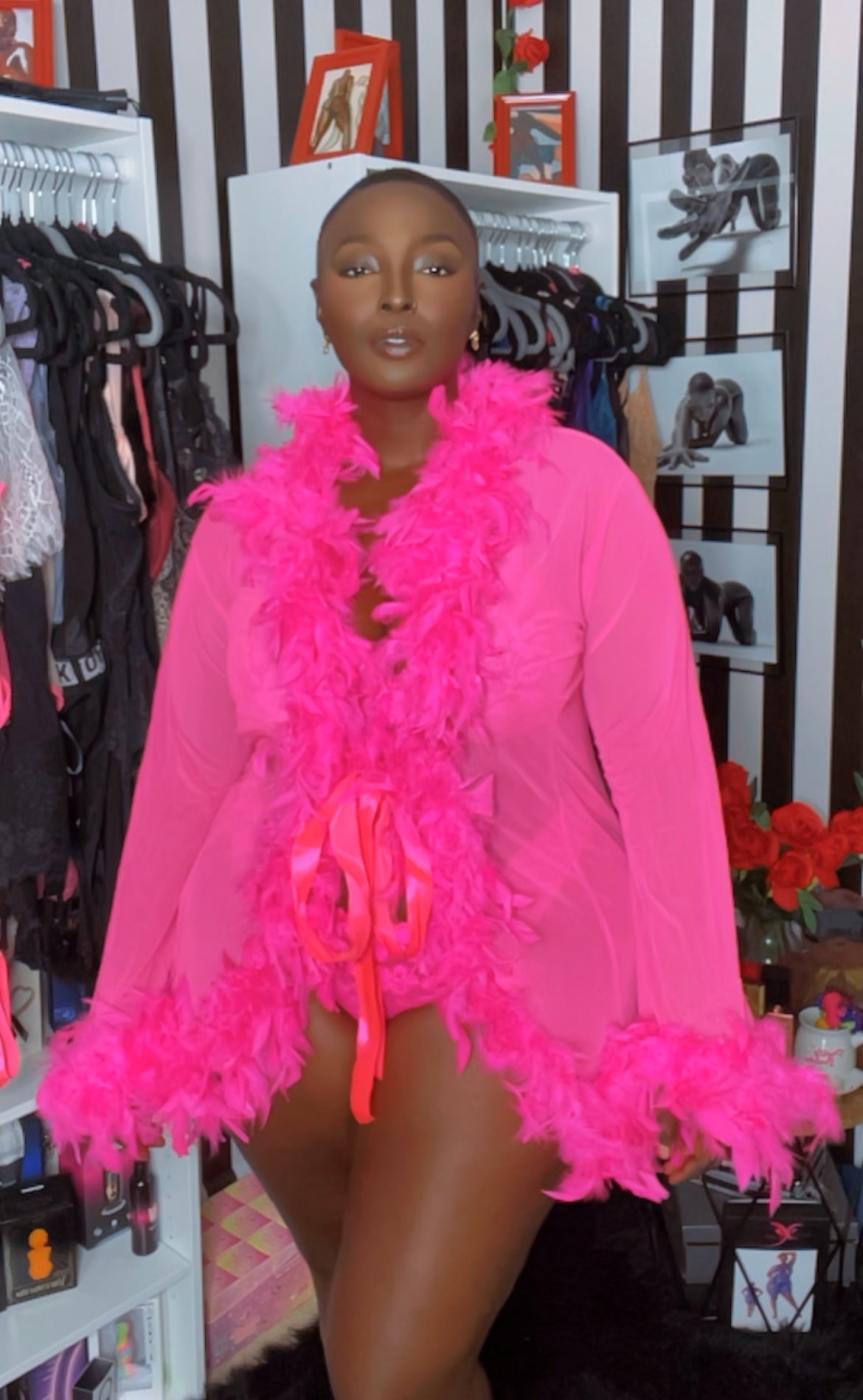 Lux short chiffon robe with feather boa trim is a playful yet elegant garment that combines the airy lightness of chiffon with the whimsical allure of a feather boa trim. This robe is designed for those who love to add a touch of glamour and fun to their loungewear.